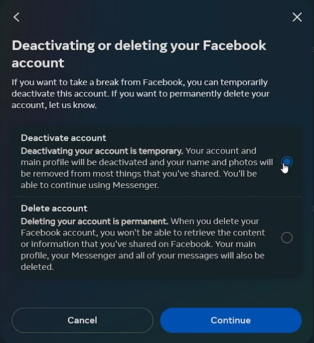 Por exemplo, se você estiver saindo de férias e quiser fazer uma pausa no Facebook enquanto mantém contato via Messenger, você pode optar por manter o Messenger ativo durante o período de desativação da sua conta.