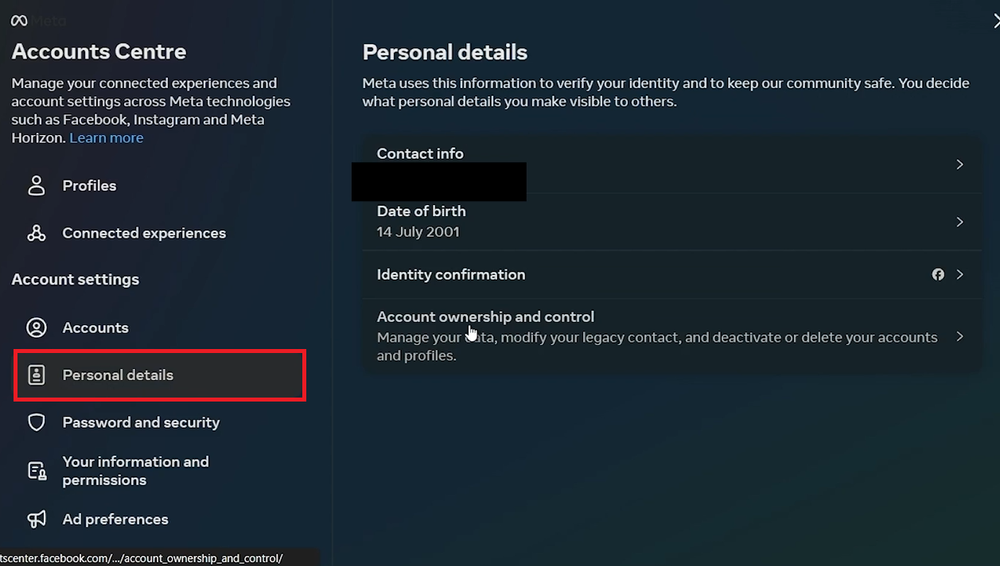 - Propriedade e controle da conta: Nesta seção, você encontrará a opção “Propriedade e controle da conta”. Clicar aqui abrirá uma nova janela.