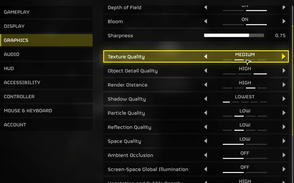 Para um PC de médio porte, defina a qualidade da textura como média, os detalhes do objeto e a distância de renderização como